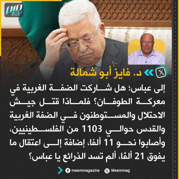 أبو شمالة: إلى عباس؛ هل شاركت الضفة الغربية في معركة الطوفان؟ فلماذا قتل جيش الاحتلال والمستوطنون في الضفة الغربية والقدس حوالي 1103 من الفلسطينيين، وأصابوا نحو 11 ألفا، إضافة إلى اعتقال ما يفوق 21 ألفًا، ألم تسد الذرائع يا عباس؟
