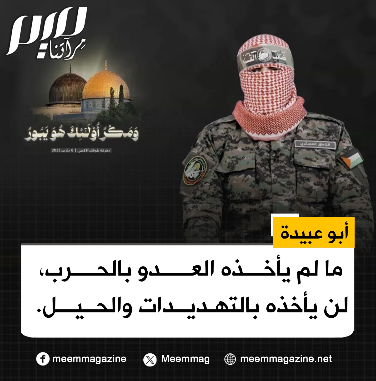 أبو عبيدة: ما لم يأخذه العدو بالحرب، لن يأخذه بالتهديدات والحيل.
