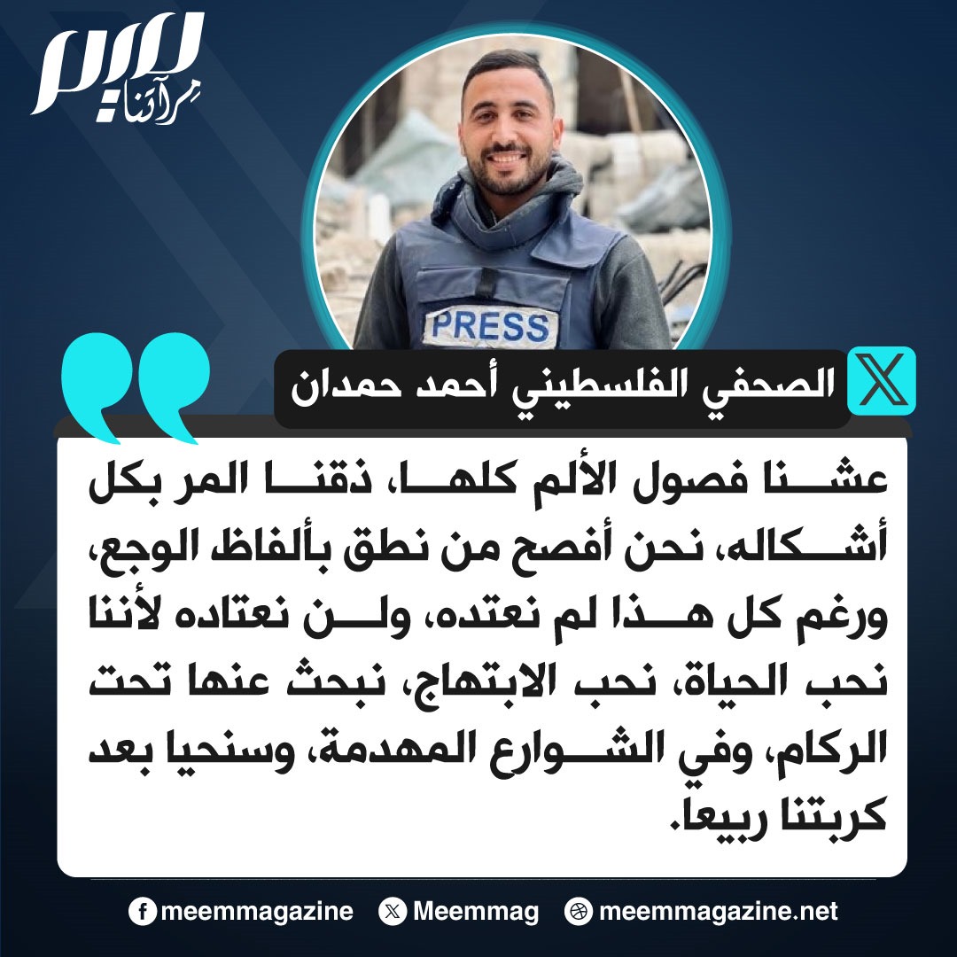 أحمد حمدان: عشنا فصول الألم كلها، ذقنا المر بكل أشكاله، نحن أفصح من نطق بألفاظ الوجع، ورغم كل هذا لم نعتده، ولن نعتاده لأننا نحب الحياة.