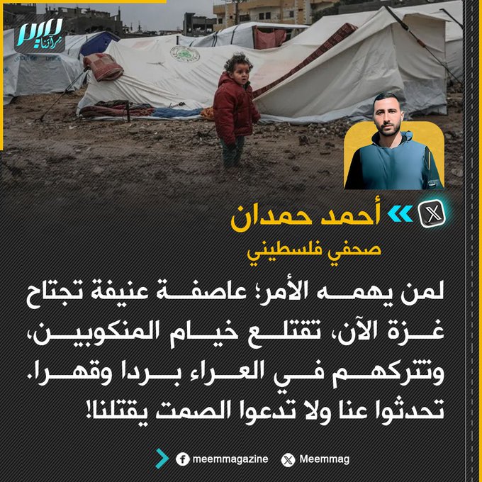 أحمد حمدان: لمن يهمه الأمر؛ عاصفة عنيفة تجتاح غزة الآن، تقتلع خيام المنكوبين، وتتركهم في العراء بردا وقهرا. تحدثوا عنا ولا تدعوا الصمت يقتلنا!