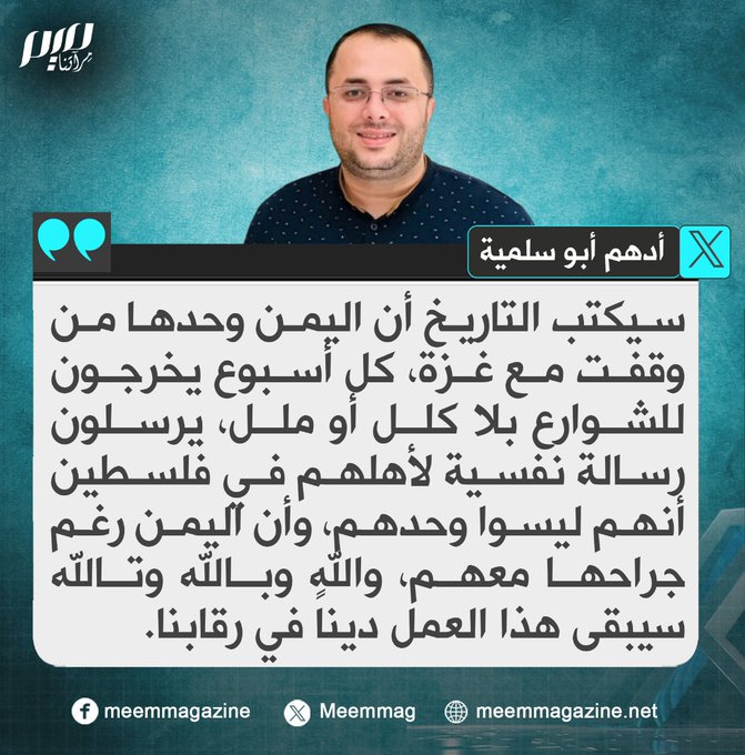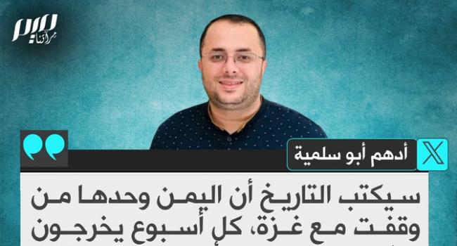 أدهم أبو سلمية: سيكتب التاريخ أن اليمن وحدها من وقفت مع غزة، كل أسبوع يخرجون للشوارع بلا كلل أو ملل، يرسلون رسالة نفسية لأهلهم في فلسطين أنهم ليسوا وحدهم، وأن اليمن رغم جراحها معهم، والله وبالله وتالله سيبقى هذا العمل ديناً في رقابنا.
