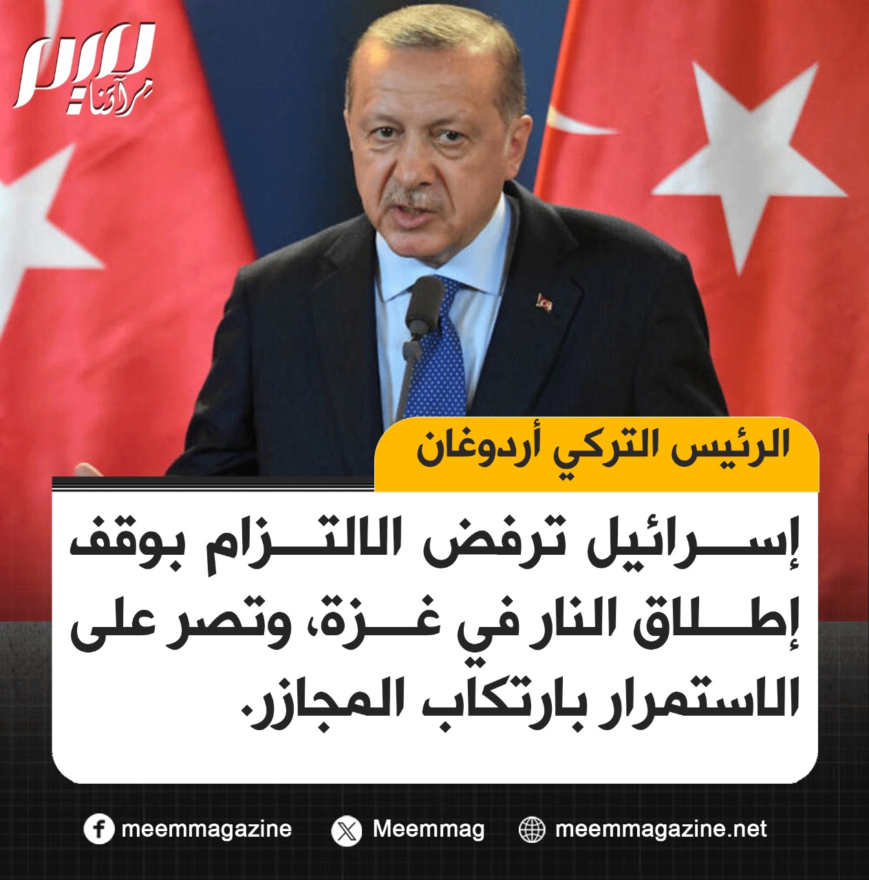 أردوغان: إسرائيل ترفض الالتزام بوقف إطلاق النار في غزة، وتصر على الاستمرار بارتكاب المجازر.