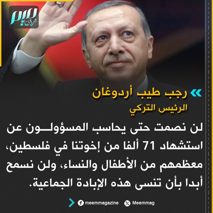 أردوغان: لن نصمت حتى يُحاسب المسؤولون عن استشهاد 71 ألفا من إخوتنا في فلسطين، ولن نسمح أبدا بأن تُنسى هذه الإبادة الجماعية.