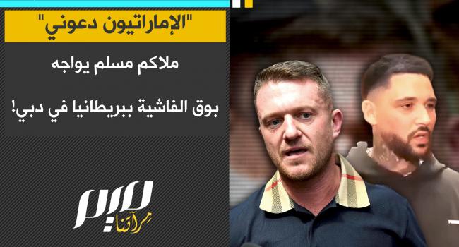 لمحه يجري لقاءا تلفزيونيا في دبي.. شاهد كيف واجه مصارع بريطاني مسلم البلطجي الفاشي تومي روبنسون، الذي يتصدر حملات التحريض ضد المسلمين والإسلام في بريطانيا، بعدما رآه في دبي. "ما الذي تفعله هنا أيها الوغد العنصري الحقير؟ يكره المسلمين، ثم يأتي لبلد مسلم.. رأيتك تمسك القرآن وتقول أنا ضد هذا الكتاب" رد روبنسون؟ "أنا هنا بدعوة من الإماراتيين الذين سألتقيهم غدا لمناقشة المنظمات الإرهابية في بريطانيا".