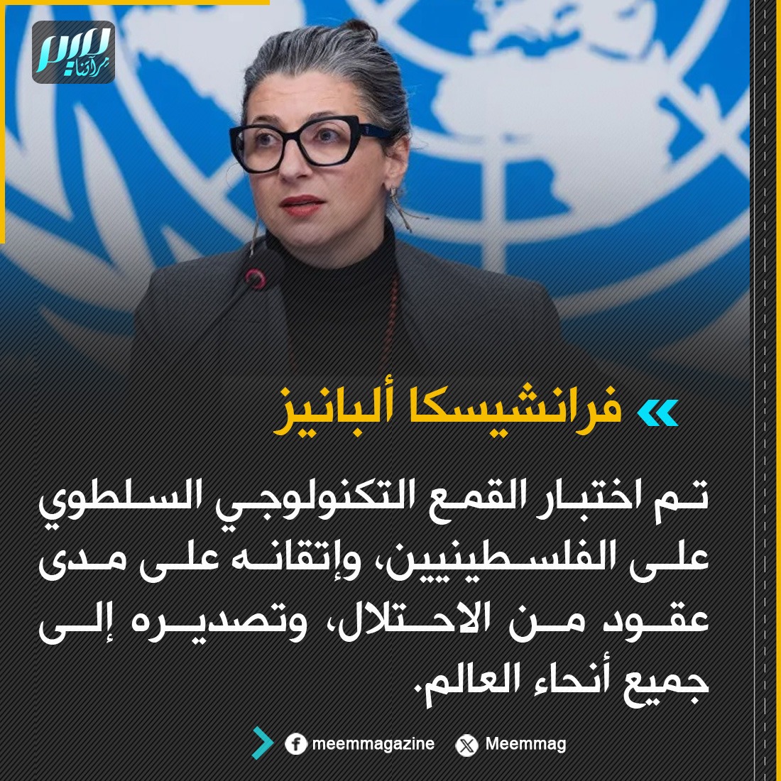ألبانيز: تم اختبار القمع التكنولوجي السلطوي على الفلسطينيين، وإتقانه على مدى عقود من الاحتلال، وتصديره إلى جميع أنحاء العالم.