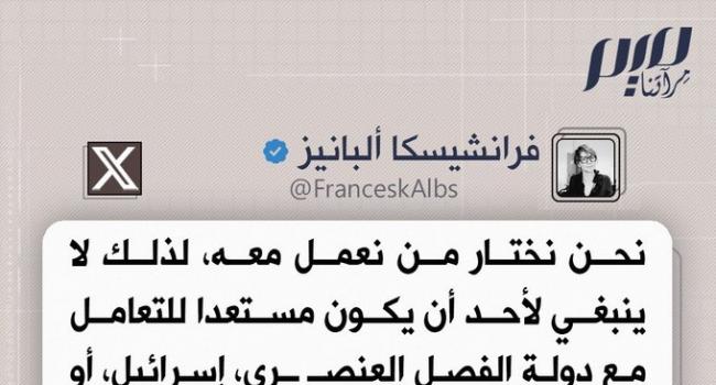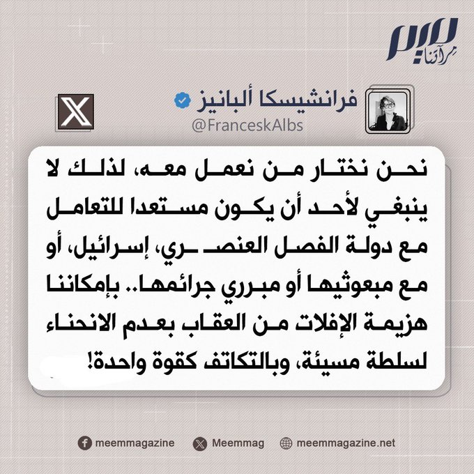 المقررة الأممية فرانشيسكا ألبانيز: لا ينبغي لأحد أن يكون مستعدا للتعامل مع دولة الفصل العنصـ ـري، إسرائيل، أو مع مبعوثيها أو مبرري جرائمها!