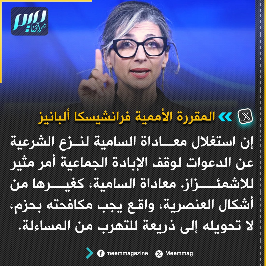 ألبانيز: معـ ـاداة السـ ـامية، كغيرها من أشكال العنصرية، واقع يجب مكافحته بحزم، لا تحويله إلى ذريعة للتهرب من المساءلة.