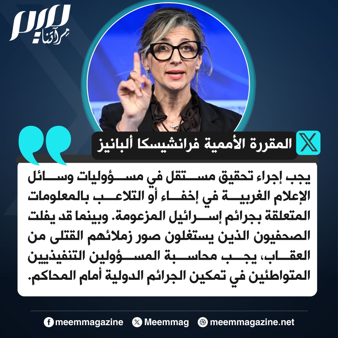 ألبانيز: يجب محاسبة المسؤولين التنفيذيين المتواطئين في تمكين الجرائم الدولية أمام المحاكم.