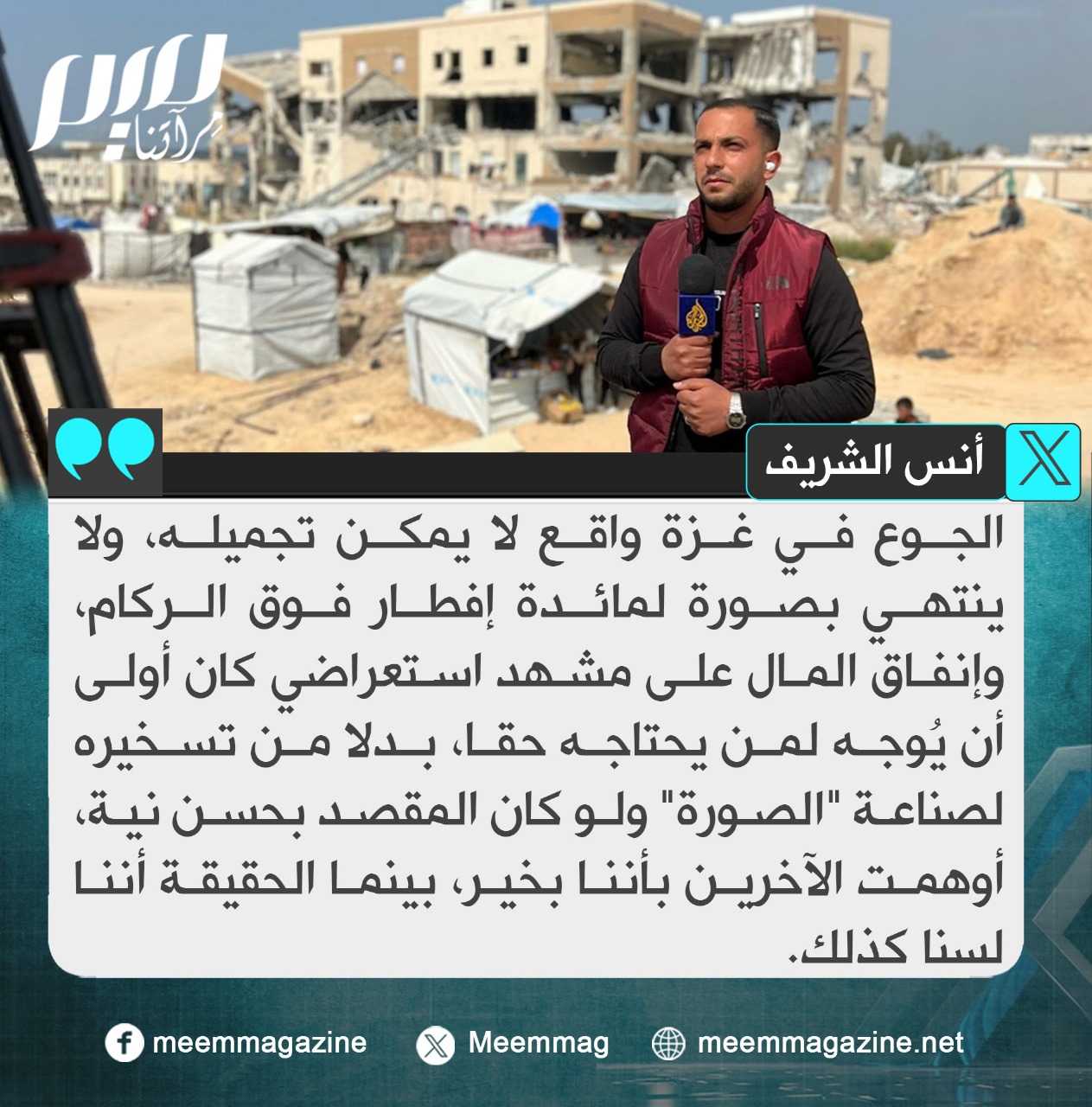 أنس الشريف: الجوع في غزة واقع لا يمكن تجميله، ولا ينتهي بصورة لمائدة إفطار فوق الركام، وإنفاق المال على مشهد استعراضي كان أولى أن يُوجه لمن يحتاجه حقا، بدلا من تسخيره لصناعة "الصورة" ولو كان المقصد بحسن نية، أوهمت الآخرين بأننا بخير، بينما الحقيقة أننا لسنا كذلك.