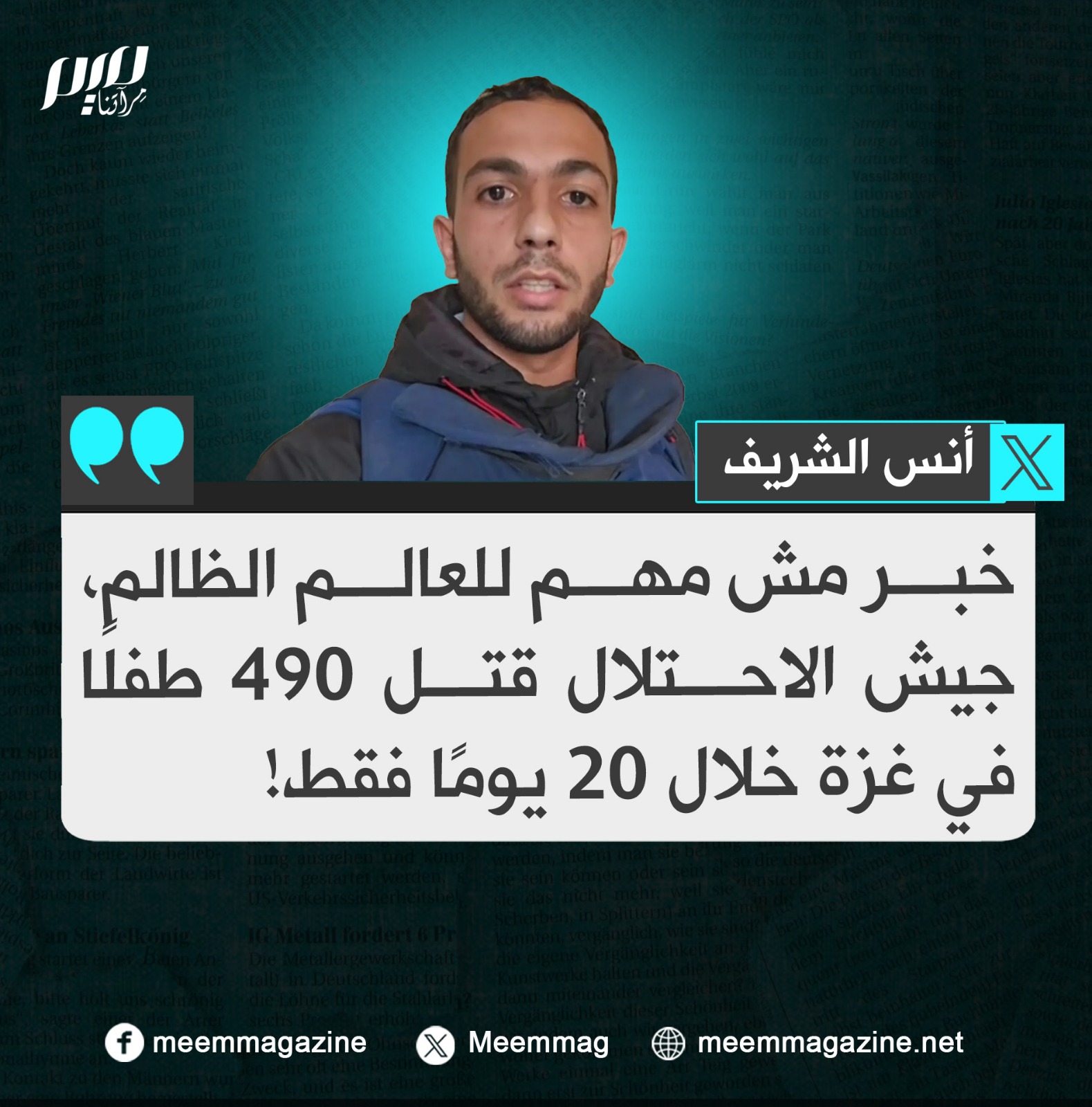 أنس الشريف: خبر مش مهم للعالم الظالم، جيش الاحتلال قتل 490 طفلًا في غزة خلال 20 يومًا فقط!