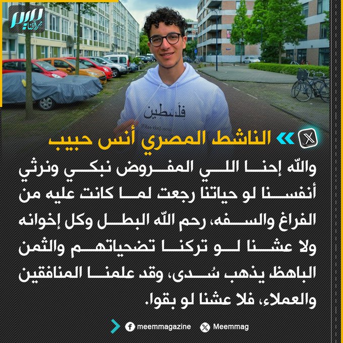 أنس حبيب: والله إحنا اللي المفروض نبكي ونرثي أنفسنا لو حياتنا رجعت لما كانت عليه من الفراغ والسفه، رحم الله البطل وكل إخوانه ولا عشنا لو تركنا تضحياتهم والثمن الباهظ يذهب سُدى، وقد علمنا المنافقين والعملاء، فلا عشنا لو بقوا.