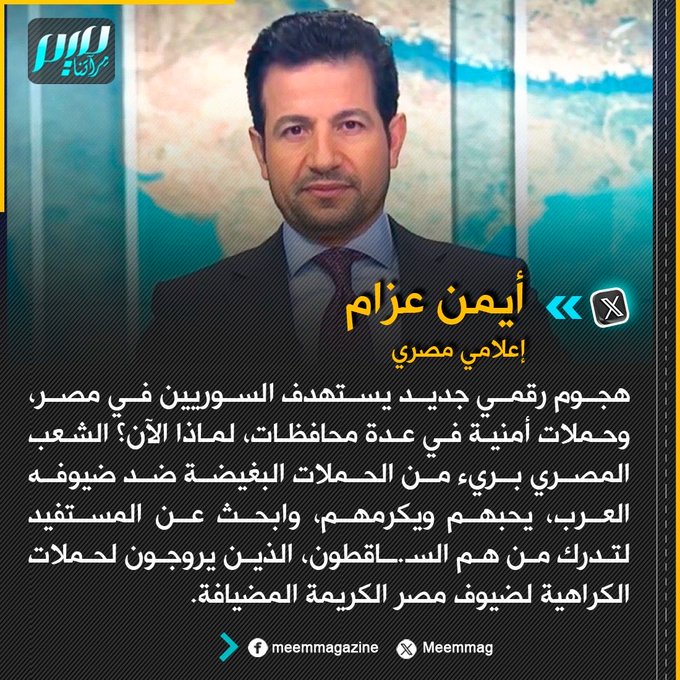 أيمن عزام: هجوم رقمي جديد يستهدف السوريين في مصر، وحملات أمنية في عدة محافظات، لماذا الآن؟ الشعب المصري بريء من الحملات البغيضة ضد ضيوفه العرب، يحبهم ويكرمهم، وابحث عن المستفيد لتدرك من هم السـ.ـاقطون، الذين يروجون لحملات الكراهية لضيوف مصر الكريمة المضيافة.
