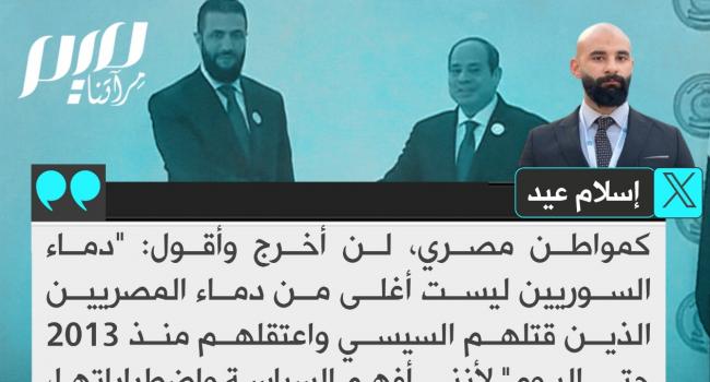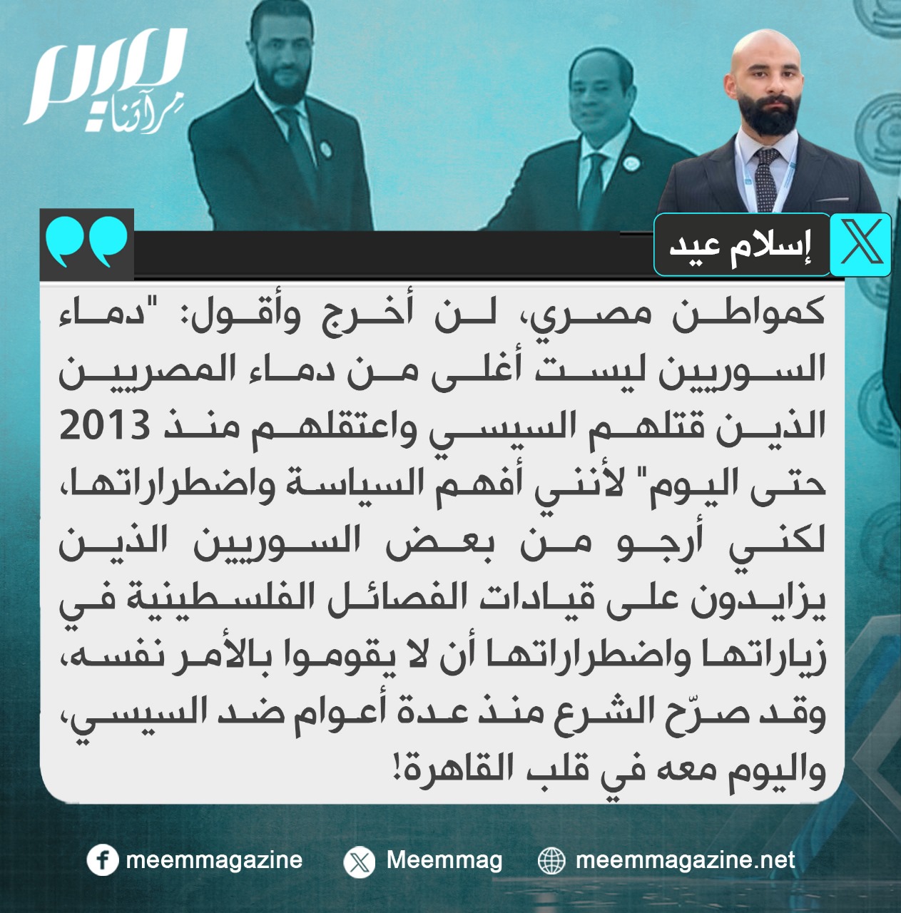 إسلام عيد: كمواطن مصري، لن أخرج وأقول: "دماء السوريين ليست أغلى من دماء المصريين الذين قتلهم السيسي واعتقلهم منذ 2013 حتى اليوم" لأنني أفهم السياسة واضطراراتها، لكني أرجو من بعض السوريين الذين يزايدون على قيادات الفصائل الفلسطينية في زياراتها واضطراراتها أن لا يقوموا بالأمر نفسه، وقد صرّح الشرع منذ عدة أعوام بأن خطأ الرئيس مرسي كان في تخلي الإخوان عن السلاح، وأن انقلاب السيسي كان بدفع من الأمريكان، واليوم معه في قلب القاهرة يسلّم عليه!