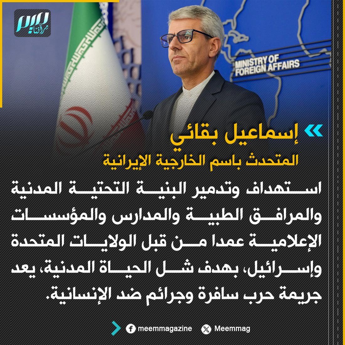 إسماعيل بقائي: استهداف وتدمير البنية التحتية المدنية والمرافق الطبية والمدارس والمؤسسات الإعلامية عمدا من قبل الولايات المتحدة وإسرائيل، بهدف شل الحياة المدنية، يعد جريمة حرب سافرة وجرائم ضد الإنسانية.