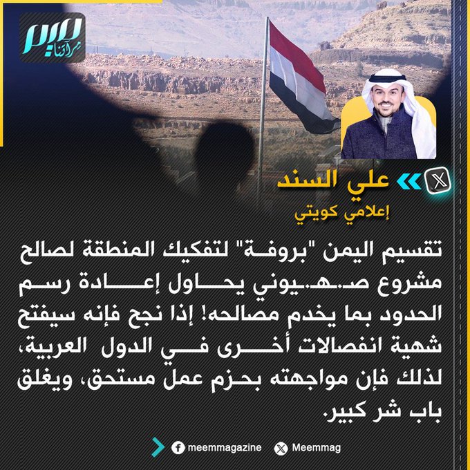 إعلامي كويتي: تقسيم اليمن "بروفة" لتفكيك المنطقة لصالح مشروع صـ.ـهـ.ـيوني يحاول إعادة رسم الحدود بما يخدم مصالحه!
