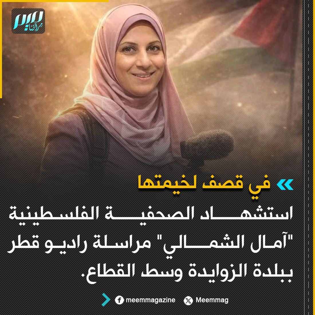 استشهاد الصحفية الفلسطينية "آمال الشمالي" مراسلة راديو قطر في قصف لخيمتها ببلدة الزوايدة وسط القطاع