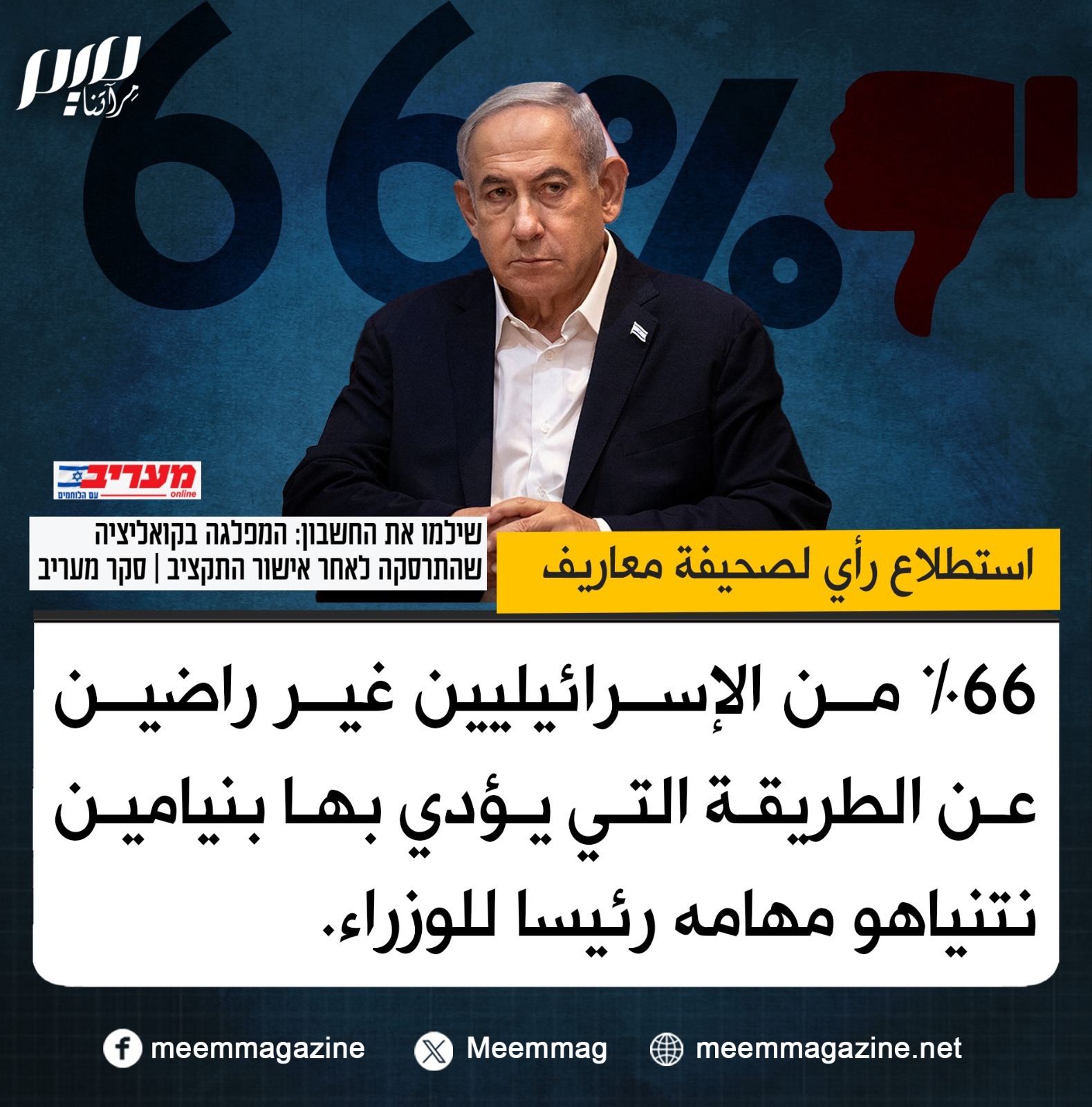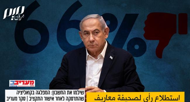استطلاع رأي لصحيفة معاريف: 66% من الإسرائيليين غير راضين عن الطريقة التي يؤدي بها بنيامين نتنياهو مهامه رئيسا للوزراء.