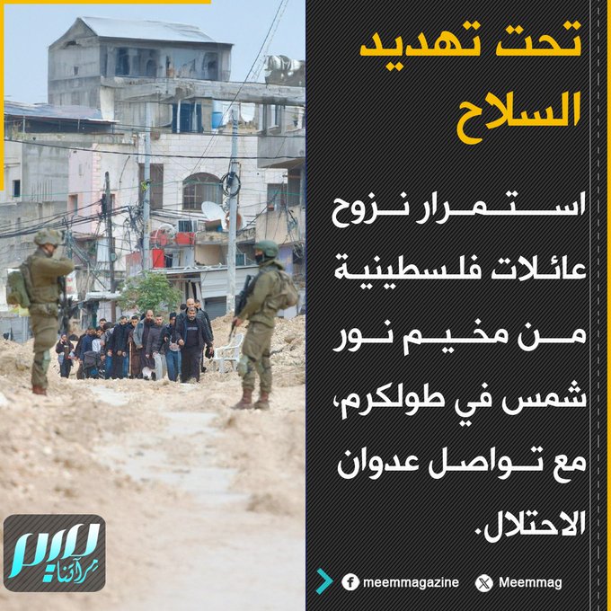 تحت تهديد السلاح.. استمرار نزوح عائلات فلسطينية من مخيم نور شمس في طولكرم، مع تواصل عدوان الاحتلال.