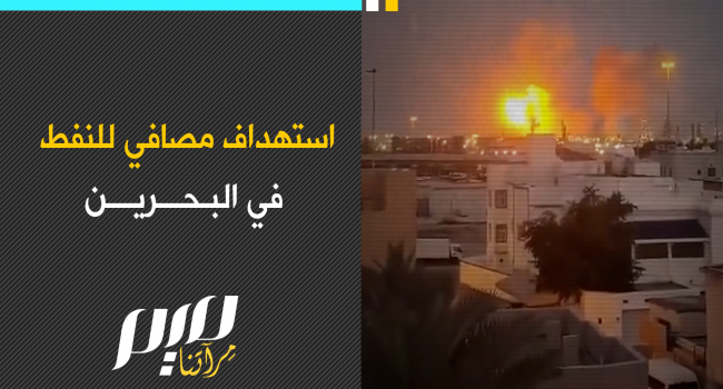مشاهد متداولة تُظهر اشتعال النيران في مصافي للنفط في البحرين عقب تعرضها لهجوم بطائرة مسيرة.