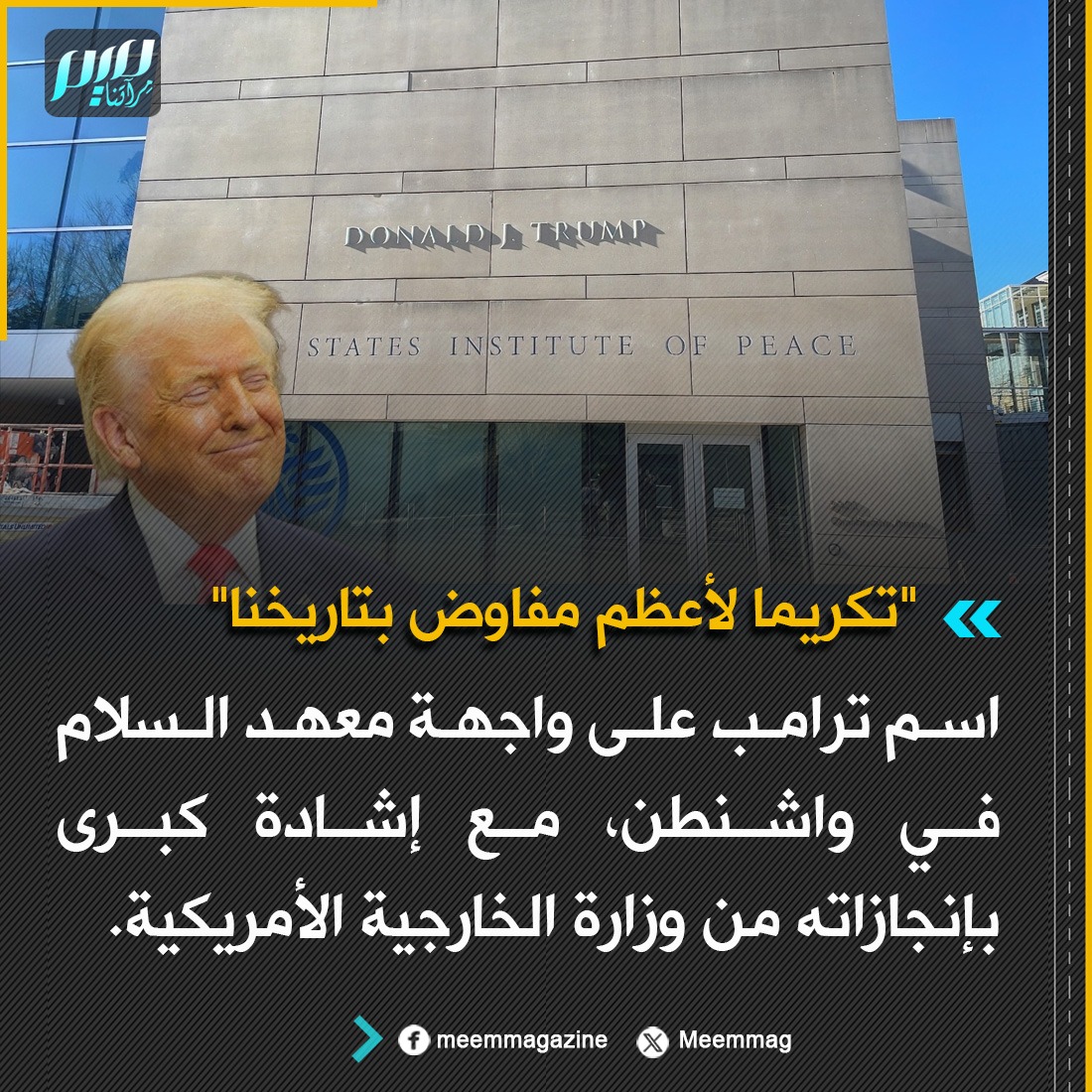 اسم ترامب على واجهة معهد السلام في واشنطن، مع إشادة كبرى بإنجازاته من وزارة الخارجية الأمريكية التي قالت ببيانها: "تكريما لأعظم مفاوض بتاريخنا" .