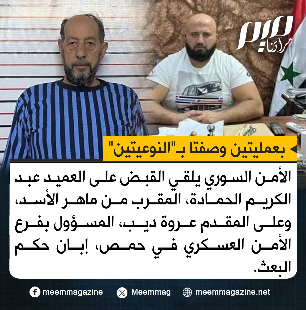 الأمن السوري يلقي القبض على العميد عبد الكريم الحمادة، المقرب من ماهر الأسد، وعلى المقدم عروة ديب، المسؤول بفرع الأمن العسكري في حمص، إبان حكم البعث.