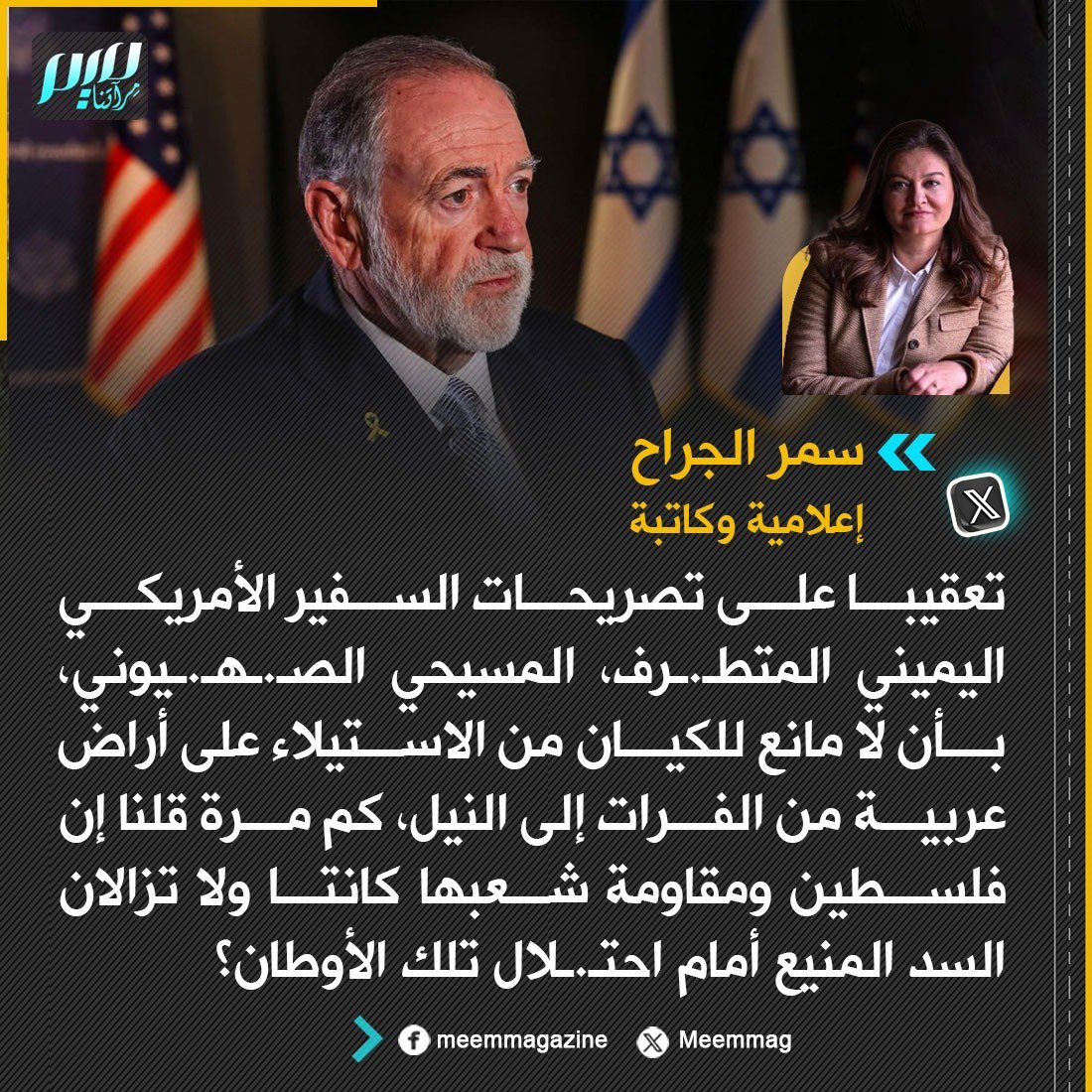 الإعلامية سمر الجراح: تعقيبا على تصريحات السفير الأمريكي اليميني المتطـ.ـرف، المسيحي الصـ.ـهـ.ـيوني، بأن لا مانع للكيان من الاستيلاء على أراض عربية من الفرات إلى النيل، كم مرة قلنا إن فلسطين ومقـ.ـاومة شعبها كانتا ولا تزالان السد المنيع أمام احتـ.ـلال تلك الأوطان؟