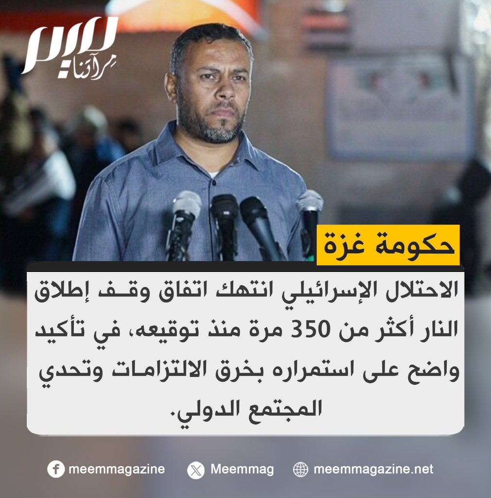 الناطق باسم المكتب الإعلامي الحكومي بغزة إسماعيل الثوابتة: الاحتلال الإسرائيلي انتهك اتفاق وقف إطلاق النار أكثر من 350 مرة منذ توقيعه!