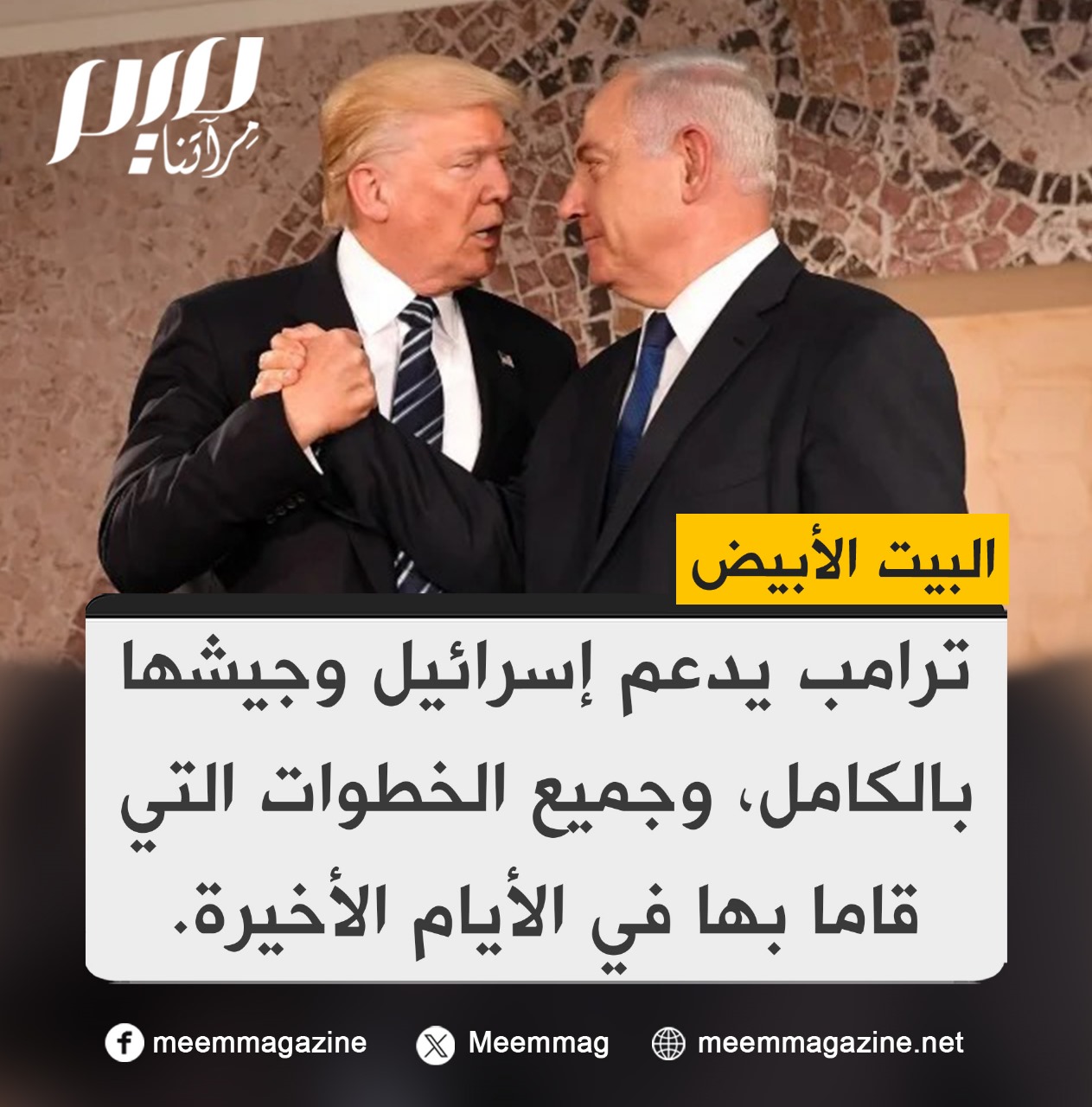 البيت الأبيض: ترامب يدعم إسرائيل وجيشها بالكامل، وجميع الخطوات التي قاما بها في الأيام الأخيرة.