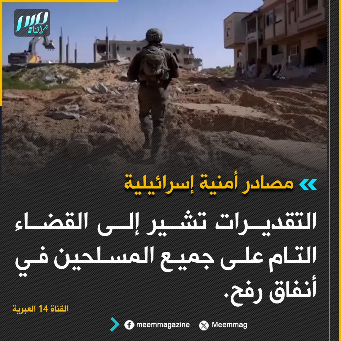 مصادر أمنية إسرائيلية للقناة 14 العبرية: التقديرات تشير إلى القضاء التام على جميع المسلحين في أنفاق رفح.