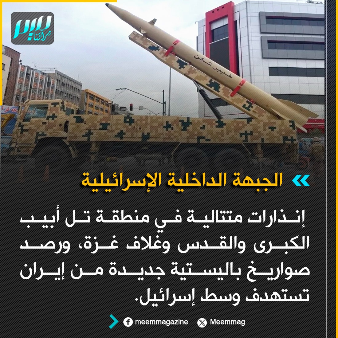 الجبهة الداخلية الإسرائيلية: إنذارات متتالية في منطقة تل أبيب الكبرى والقدس وغلاف غزة، ورصد صواريخ باليستية جديدة من إيران تستهدف وسط إسرائيل.