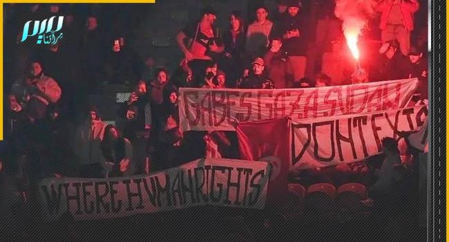الجمهور التونسي يتضامن مع قابس وغزة والسودان، خلال المباراة الودية التي جمعت المنتخب التونسي بنظيره البرازيلي في ملعب بيار موروا.