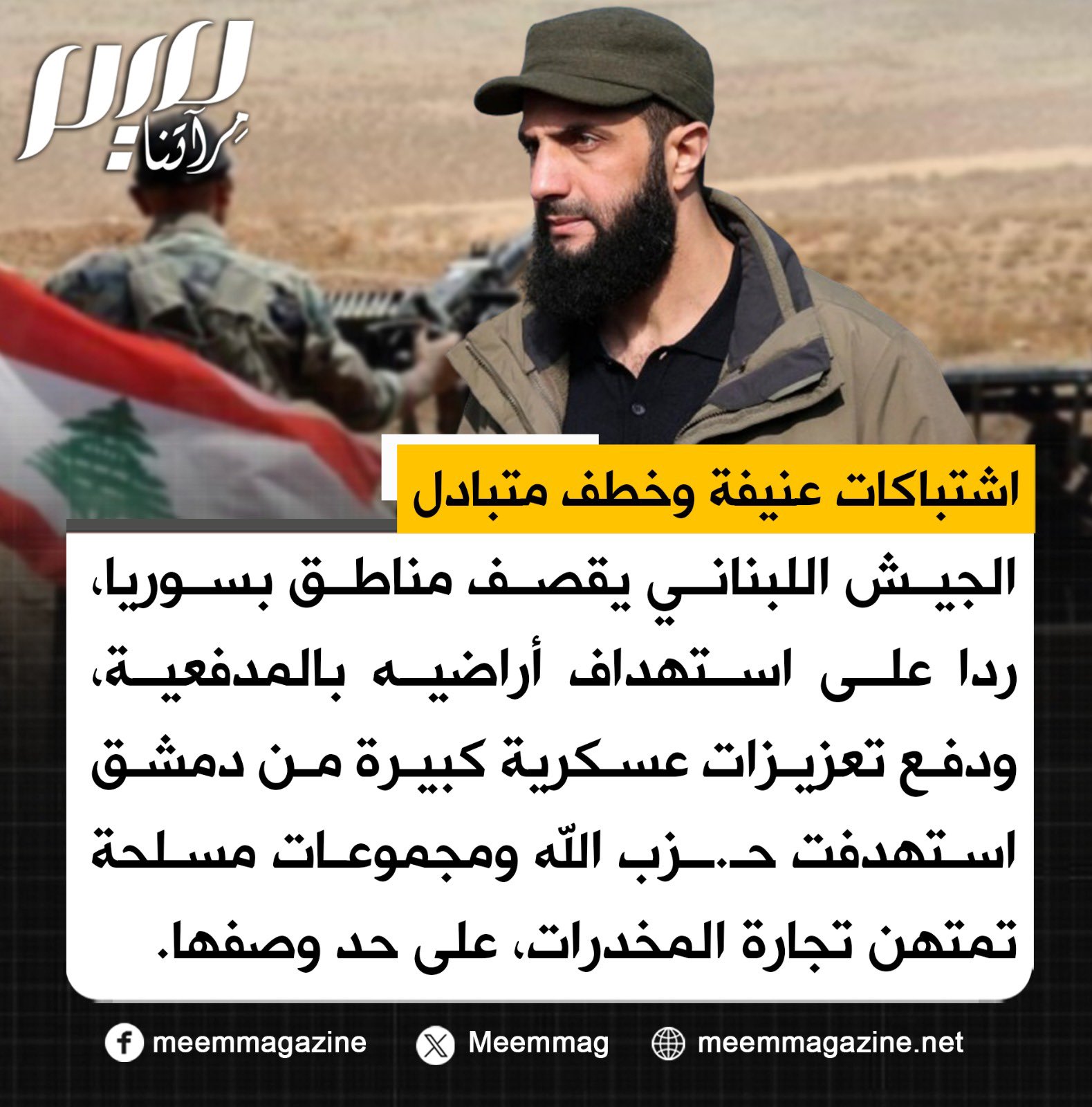 اشتباكات عنيفة وخطف متبادل.. الجيش اللبناني يقصف مناطق بسوريا، ردا على استهداف أراضيه بالمدفعية، ودفع تعزيزات عسكرية كبيرة من دمشق استهدفت حـ.ـزب الله ومجموعات مسلحة تمتهن تجارة المخدرات، على حد وصفها، تجاوزت الحدود.