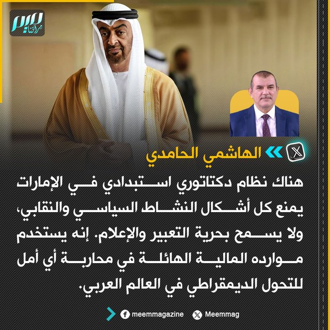الحامدي: النظام الدكتاتوري الاستبدادي في الإمارات يستخدم موارده المالية الهائلة لمحاربة أي أمل للتحول الديمقراطي في العالم العربي