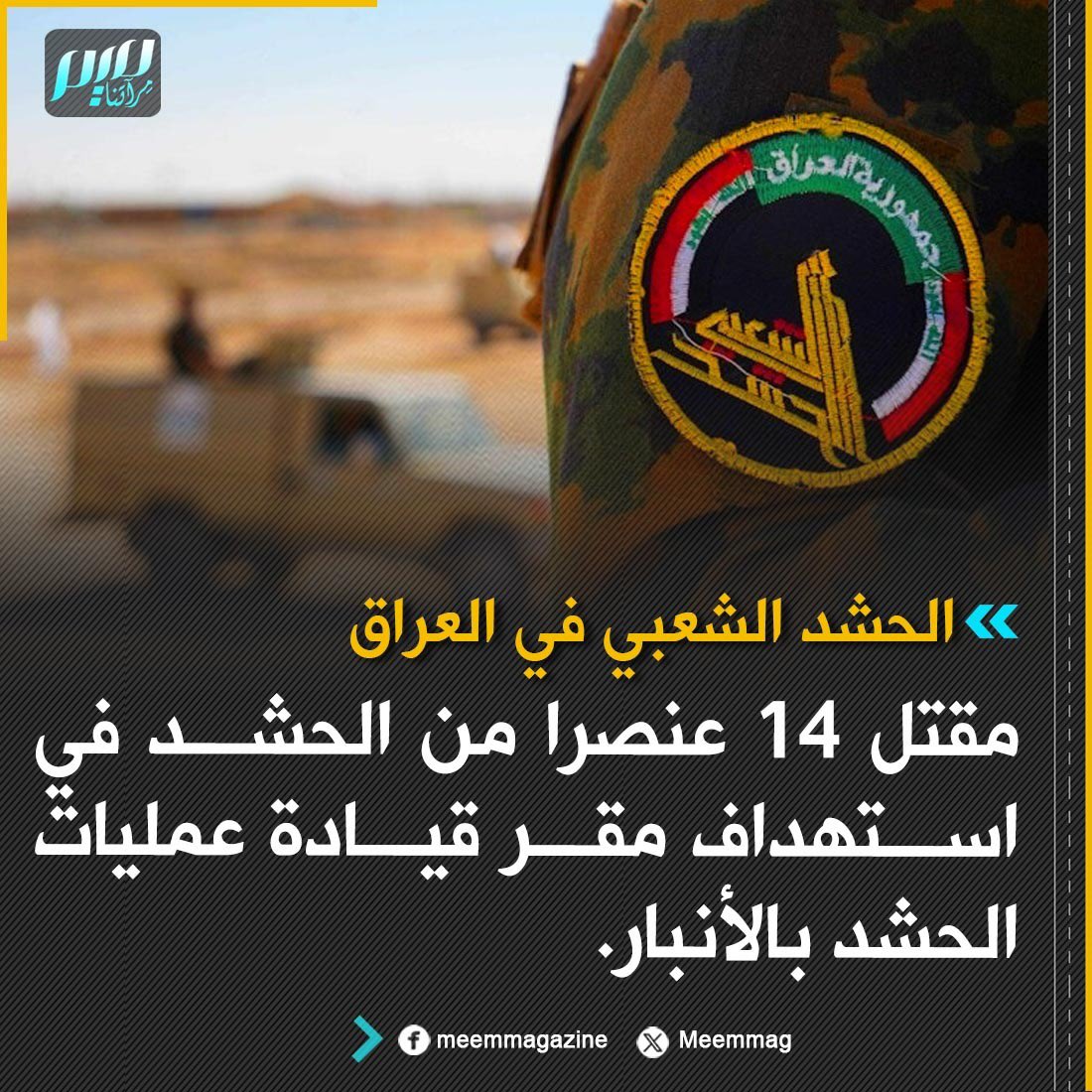 الحشد الشعبي في العراق: مقتل 14 عنصرا من الحشد في استهداف مقر قيادة عمليات الحشد بالأنبار.