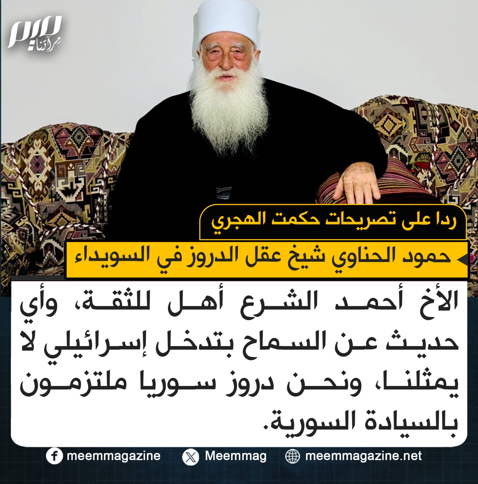 ردا على تصريحات حكمت الهجري.. الحناوي: الأخ أحمد الشرع أهل للثقة، وأي حديث عن السماح بتدخل إسرائيلي لا يمثلنا، ونحن دروز سوريا ملتزمون بالسيادة السورية.