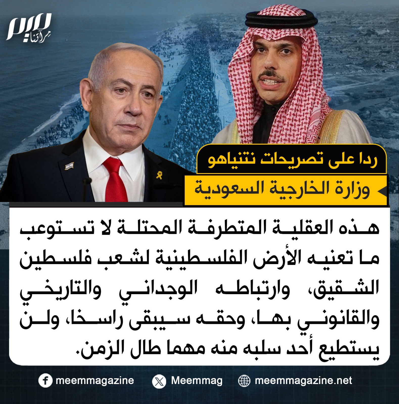 ردا على تصريحات نتنياهو.. الخارجية السعودية: هذه العقلية المتطرفة المحتلة لا تستوعب ما تعنيه الأرض الفلسطينية لشعب فلسطين الشقيق، وارتباطه الوجداني والتاريخي والقانوني بها، وحقه سيبقى راسخا، ولن يستطيع أحد سلبه منه مهما طال الزمن.