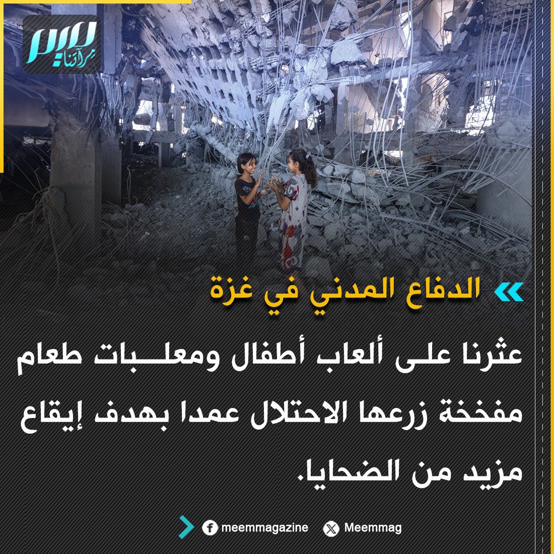 الدفاع المدني في غزة: عثرنا على ألعاب أطفال ومعلبات طعام مفـ ـخخة زرعها الاحتلال عمدا بهدف إيقاع مزيد من الضحـ ـايا.