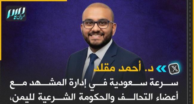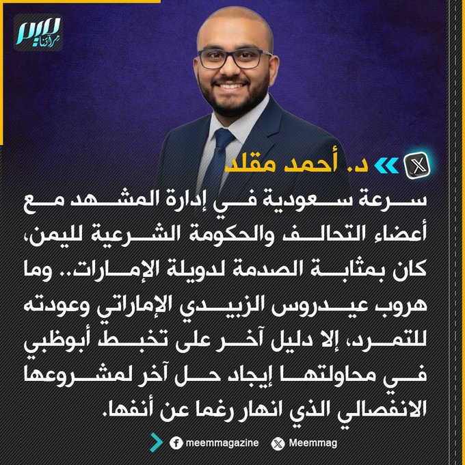 الدكتور أحمد مقلد: سرعة سعودية في إدارة المشهد مع أعضاء التحالف والحكومة الشرعية لليمن، كان بمثابة الصدمة لدويلة الإمارات، ودليل على تخبطها في محاولتها إيجاد حل آخر لمشروعها الانفصالي، الذي انهار رغما عن أنفها.