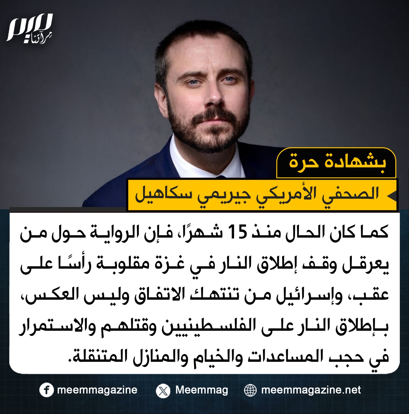 بشهادة حرة.. الصحفي الأمريكي جيريمي سكاهيل: كما كان الحال منذ 15 شهرًا، فإن الرواية حول من يعرقل وقف إطلاق النار في غزة مقلوبة رأسًا على عقب، وإسرائيل من تنتهك الاتفاق وليس العكس، بإطلاق النار على الفلسطينيين وقتلهم والاستمرار في حجب المساعدات والخيام والمنازل المتنقلة.