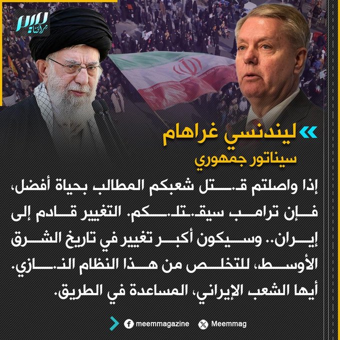 السيناتور الجمهوري ليندنسي غراهام مهددا إيران: إذا واصلتم قـ.ـتل شعبكم الذي يطالب بحياة أفضل، فإن ترامب سيقـ.ـتلـ.ـكم.. أيها الشعب الإيراني، المساعدة في الطريق.