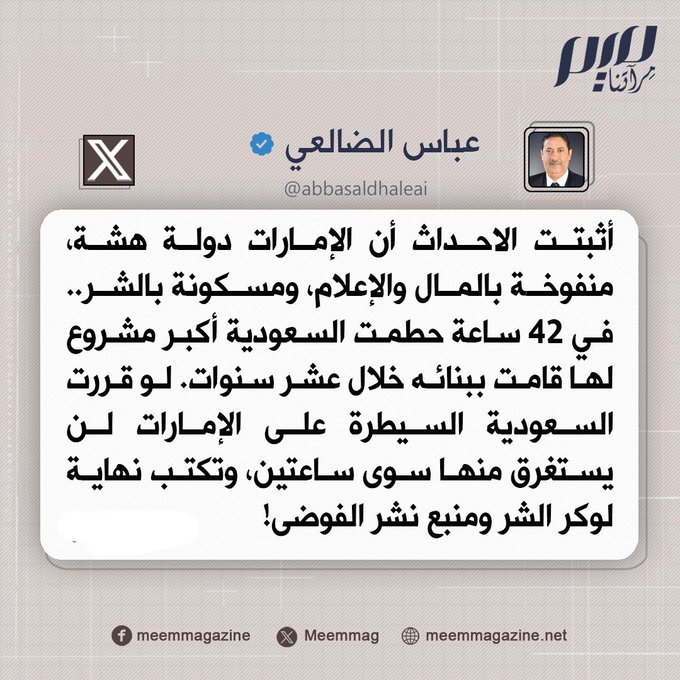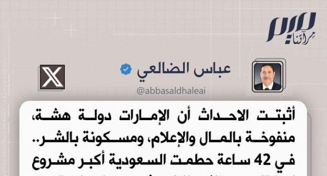 الصحفي اليمني عباس الضالعي: لو قررت السعودية السيطرة على الإمارات، لن يستغرق منها سوى ساعتين، وتكتب نهاية لوكر الشر ومنبع نشر الفوضى!