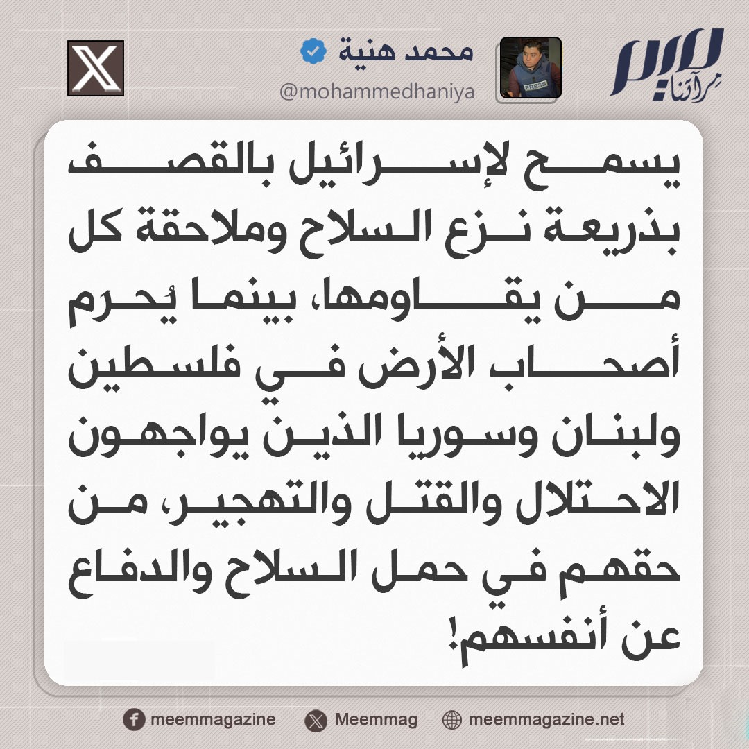 الصحفي محمد هنية: يُسمح لإسرائيل بالقصف بذريعة نزع السلاح وملاحقة كل من يقاومها، بينما يُحرَم أصحاب الأرض في فلسطين ولبنان وسوريا الذين يواجهون الاحتلال والقتل والتهجير، من حقهم في حمل السلاح والدفاع عن أنفسهم!