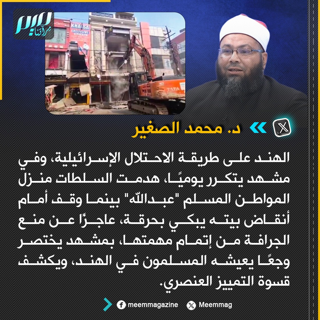 الصغير: الهند على طريقة الاحتلال الإسرائيلية، وفي مشهد يتكرر يوميًا، هدمت السلطات منزل المواطن المسلم "عبدالله" بينما وقف أمام أنقاض بيته يبكي بحرقة، عاجزًا عن منع الجرافة من إتمام مهمتها، بمشهد يختصر وجعًا يعيشه المسلمون في الهند، ويكشف قسوة التمييز العنصري.