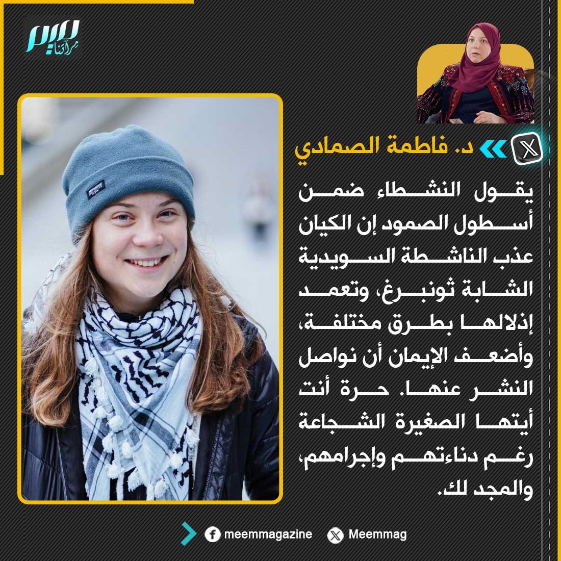 الصمادي: يقول النشطاء ضمن أسطول الصمود إن الكيان عذب الناشطة السويدية الشابة غريتا ثونبرغ، وتعمد إذلالها بطرق مختلفة، وأضعف الإيمان أن نواصل النشر عنها. حرة أنت أيتها الصغيرة الشجاعة رغم دناءتهم وإجرامهم، والمجد لك.