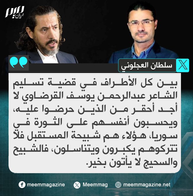 العجلوني: بين كل الأطراف في قضية تسليم الشاعر عبدالرحمن يوسف القرضاوي لا أجد أحقر من الذين حرضوا عليه، ويحسبون أنفسهم على الثورة في سوريا، هؤلاء هم شبيحة المستقبل فلا تتركوهم يكبرون ويتناسلون، فالشبيح والسحيج لا يأتون بخير.