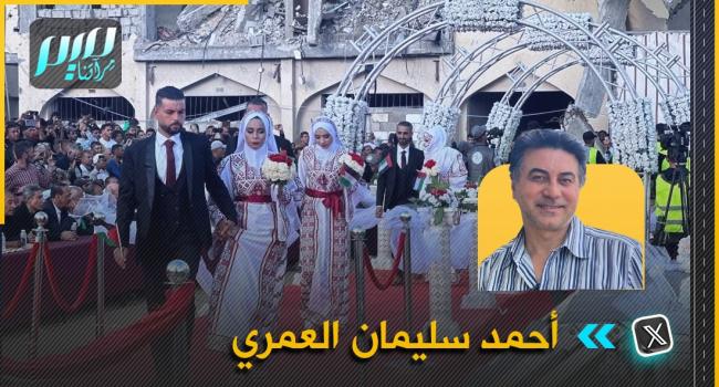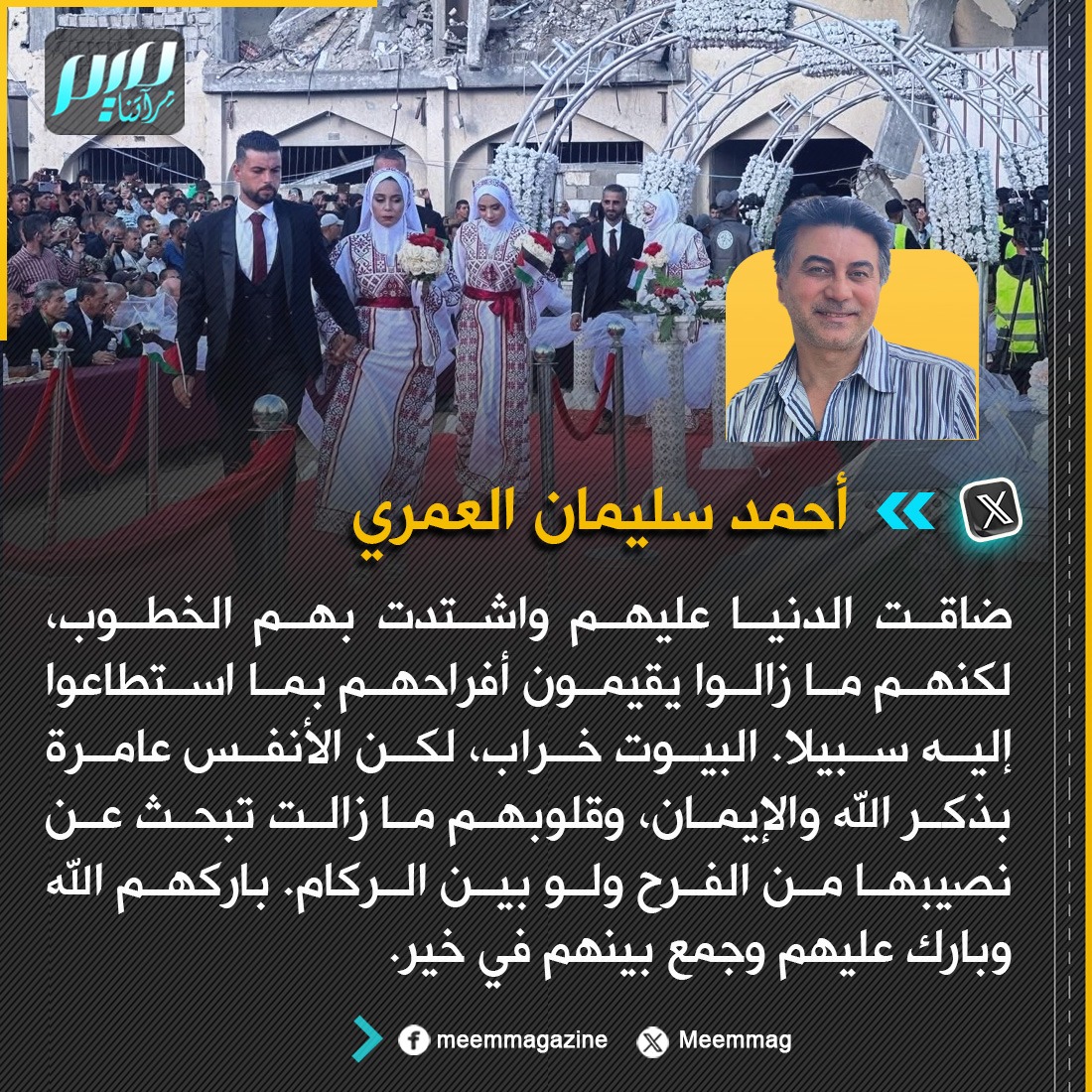 العمري: ضاقت الدنيا عليهم واشتدت بهم الخطوب، لكنهم ما زالوا يقيمون أفراحهم بما استطاعوا إليه سبيلا. البيوت خراب، لكن الأنفس عامرة بذكر الله والإيمان، وقلوبهم ما زالت تبحث عن نصيبها من الفرح ولو بين الركام. باركهم الله وبارك عليهم وجمع بينهم في خير.