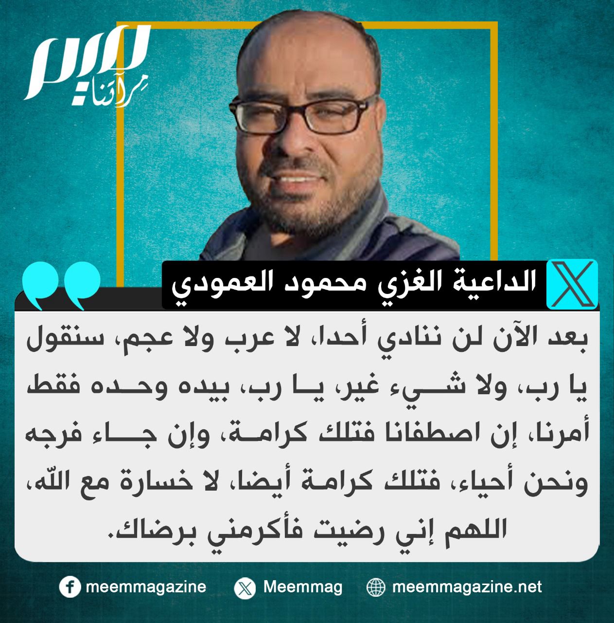 العمودي: بعد الآن لن ننادي أحدا، لا عرب ولا عجم، سنقول يا رب، ولا شيء غير، يا رب، بيده وحده فقط أمرنا، إن اصطفانا فتلك كرامة، وإن جاء فرجه ونحن أحياء، فتلك كرامة أيضا، لا خسارة مع الله، اللهم إني رضيت فأكرمني برضاك.