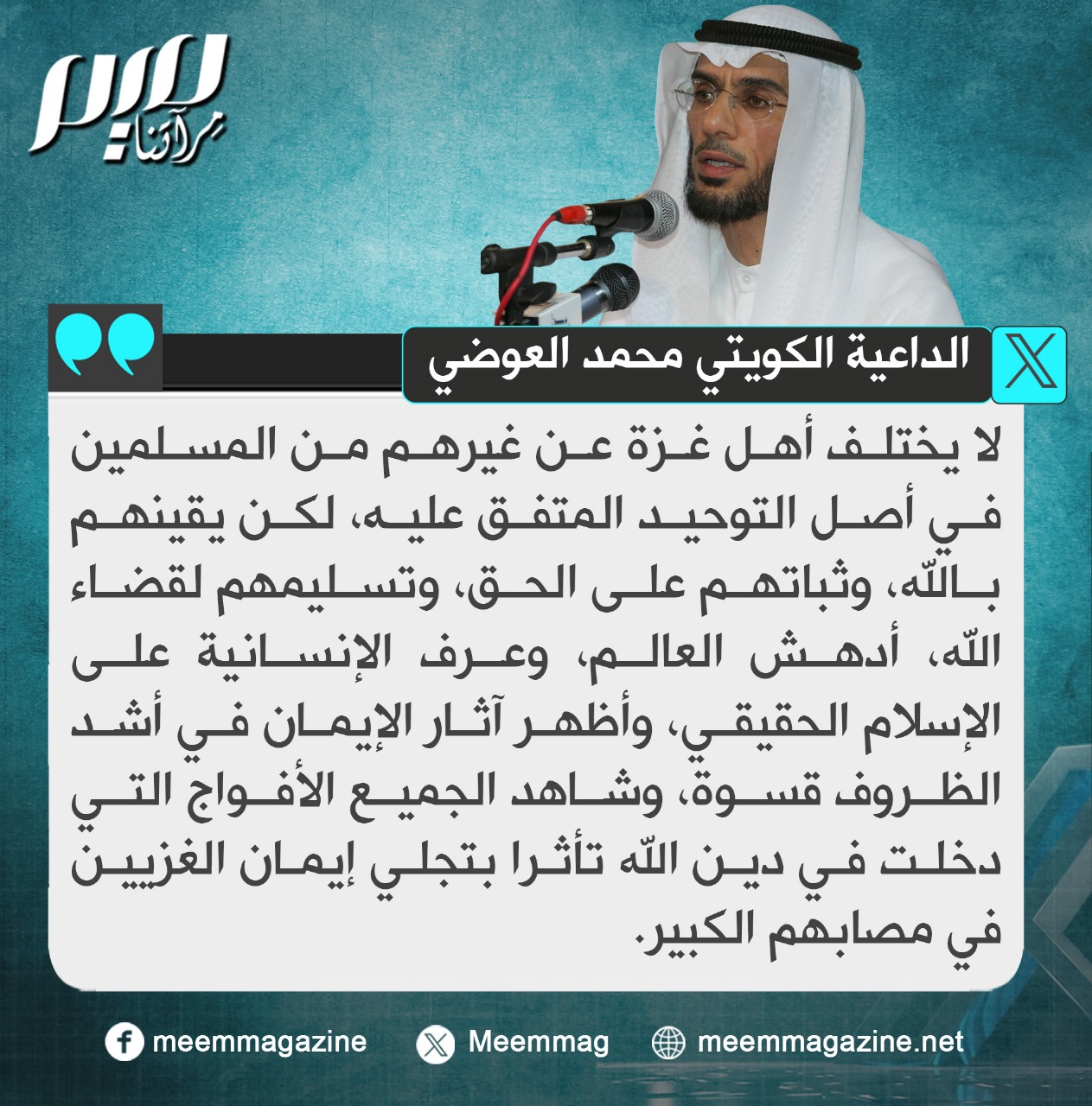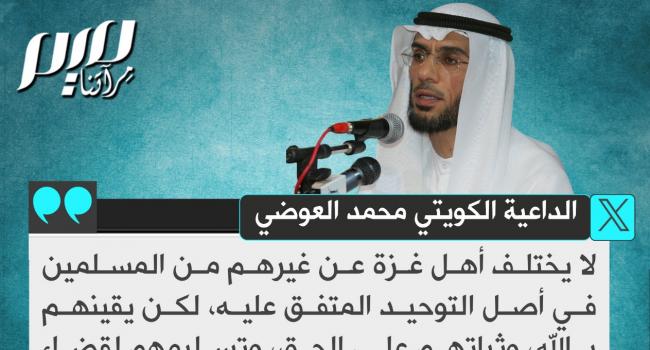 العوضي: لا يختلف أهل غزة عن غيرهم من المسلمين في أصل التوحيد المتفق عليه، لكن يقينهم بالله، وثباتهم على الحق، وتسليمهم لقضاء الله، أدهش العالم، وعرف الإنسانية على الإسلام الحقيقي، وأظهر آثار الإيمان في أشد الظروف قسوة، وشاهد الجميع الأفواج التي دخلت في دين الله تأثرا بتجلي إيمان الغزيين في مصابهم الكبير.