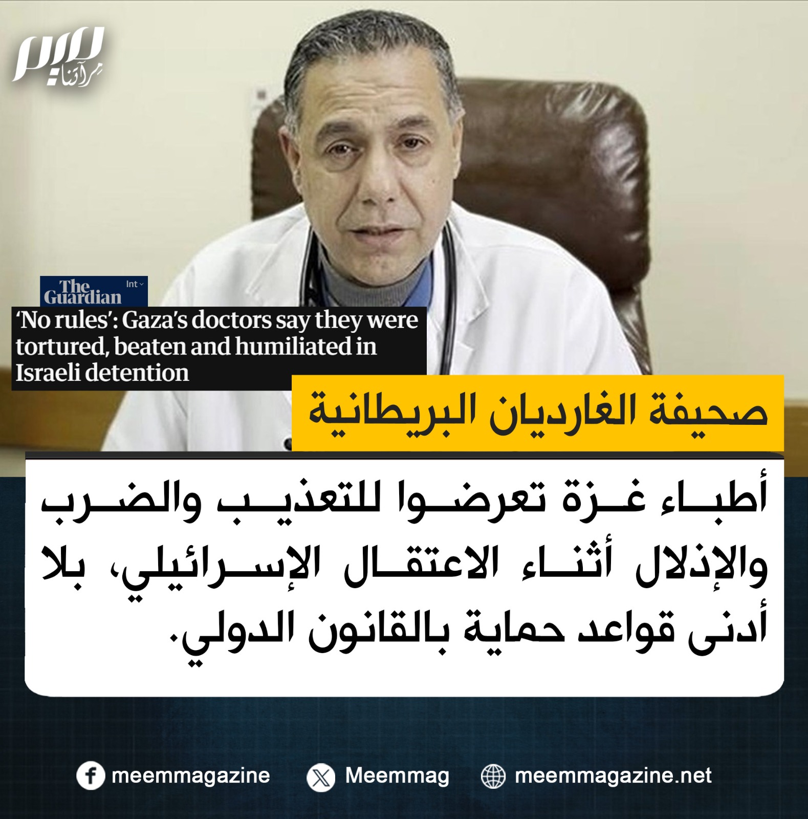 الغارديان: أطباء غزة تعرضوا للتعذيب والضرب والإذلال أثناء الاعتقال الإسرائيلي، بلا أدنى قواعد حماية بالقانون الدولي.