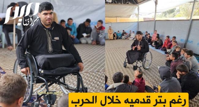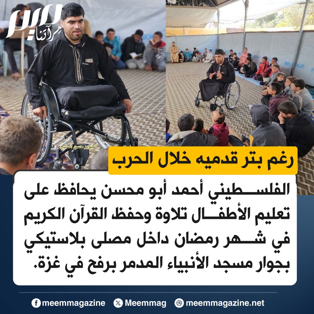 رغم بتر قدميه خلال الحرب.. الفلسطيني أحمد أبو محسن يحافظ على تعليم الأطفال تلاوة وحفظ القرآن الكريم في شهر رمضان داخل مصلى بلاستيكي بجوار مسجد الأنبياء المدمر بـرفح في غزة.